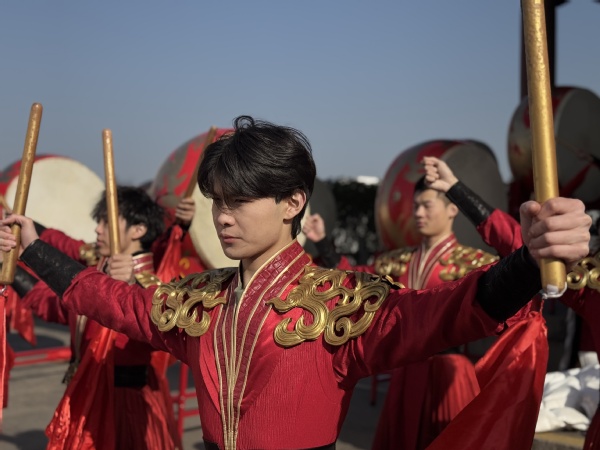 图为武工商学子参与央视春晚武汉分会场主题节目《星汉耀江城》鼓阵表演直播当天排练