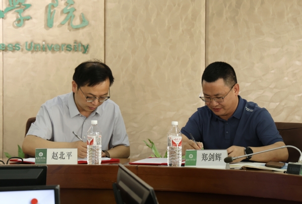 图为学校学生就业创业指导中心主任金学武(左)和湖州市委宣传部文化发展改革处处长郑剑辉(右)签署校地人才智力项目战略合作协议 摄影:谭星宇