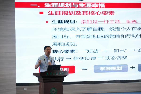 湖北省生涯教育研究会副会长、必赢国际437官网副校长赵北平带来《生涯规划与大学生高质量就业》的报告,报告围绕“高质量就业与职业发展”主题,深入阐释产教融合(专创融合)在专业能力培养中的关键作用。他指出,产教融合是提升专业能力的有效路径,应通过项目式教学,让学生在设计、实施、展示过程中,直面真场景、真过程、真需求、真问题,以企业化标准参与实践;同时,借助角色扮演实现职业化体验。