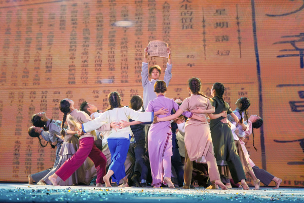 艺术与设计学院带来的舞蹈《新青年》以“报纸”为精神符号,将民主科学的思想浪潮与鲁迅等先贤的呐喊,凝练成极具张力的肢体语言与道具艺术,呈现了一场关于思想启蒙、青春觉醒的视觉风暴。二十二位舞者身着长衫,通过报纸的阅读、传递、藏匿与展开,以每一次撕扯、拼接与重组,象征思想的碰撞与时代的演进,引发观众深刻共鸣。