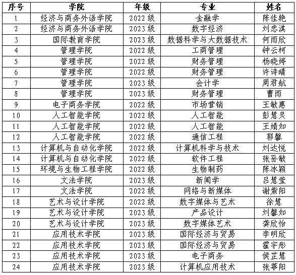 国家奖学金是由中央政府出资设立,用于奖励高校全日制本专科学生中表现特别优秀的学生,激励学生勤奋学习、努力进取,在德、智、体、美等方面全面发展。本次荣获国家奖学金的学生分别是:经济与商务外语学院2022级学生陈佳艳、2023级学生刘忠淇,国际教育学院2023级学生何雨欣,管理学院2022级学生钟云柯、杨晓婷、许诗晴、2023级学生周君航、曹雨,电子商务学院2022级学生王敏惠,人工智能学院2022级学生彭慧灵、王婧如、郭馨,计算机与自动化学院2022级学生刘达悦、张孙敏,环境与生物工程学院2022级学生陈冰颖,文法学院2022级学生谢紫阳、2023级学生吕慧莹,艺术与设计学院2022级学生徐慧、2023级学生刘馨如、龚欣怡,应用技术学院2023级学生李明欣、霍宇彤、侯芷慧、张葶阳,他们每人将获得10000元奖学金。