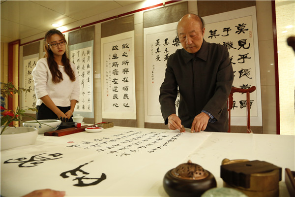 陶梅生教授展示书法 摄影:林典