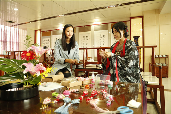 此外,现场还有很多传统文化的体验活动吸引了同学们纷纷参与其中,有传统发簪头饰的制作,苏绣、传统弓箭、茶艺的展示等,大家边学边做,其乐融融。不少学生对传统发簪的制作尤为感兴趣,只见2014级电信专业的学生王文颖拿出一块事先裁好的正方形棉布,将其对折后在边沿涂上一层胶水。“涂胶水时要注意先内后外,再对折后在顶端涂上少许胶水,然后将两边一卷,一朵簪花就完成啦。”王文颖边示范边说道。