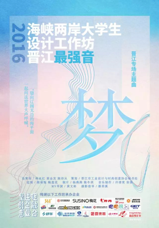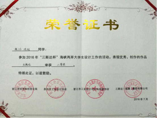 此次设计工坊中,来自海峡两岸高校的师生约100人,必赢国际437官网师生在与台湾和大陆众多一本高校学生的同场竞技中,展现出了良好的专业能力和素养,其中12级学生黄璇璇、罗恒杰,13级学生徐志坚还被选为矮凳网校园代言人。活动期间黄璇璇还受邀与台中科技大学、天津理工大学的学生共同录制了晋江工业设计协会会歌——《梦》,并作为2016晋江海峡两岸大学生设计工作坊主题曲。