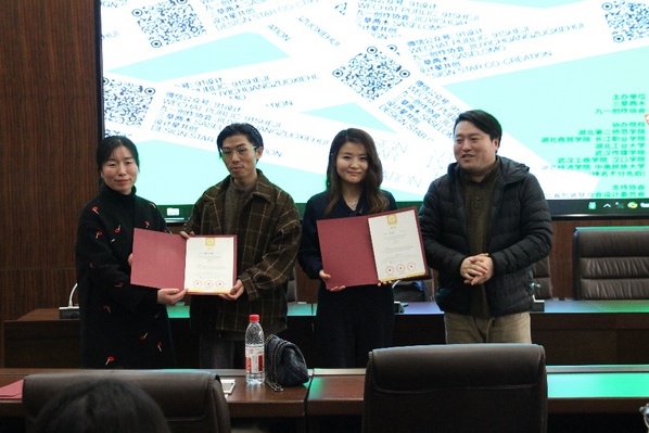 仪式现场,姓会创始人、摆谱创意总监张艺彬和武汉渔可得网络创始人马茵受聘为学校创客导师。马茵老师结合自己的设计经历,向艺术与设计学院师生分享了品牌形象IP的塑造方法和设计理念。她以莫愁村文化旅游项目为例,向现场师生展示了自己的指导作品《长滩焦切》,以及代表作《贪吃蛇大作战》的游戏界面设计和角色绘制理念。她谈到,“好的IP形象要让人有鲜明的记忆点,如天猫、京东的品牌形象简单、主题明确,但消费者一眼就能记住,这就是IP设计的关键。”