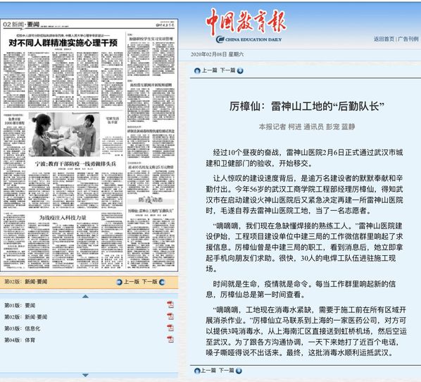 “武汉是我的家,我一直生活在这里,当然要尽全力守护!”厉樟仙不仅主动参与志愿服务,还动员爱人、儿子做了雷神山医院工地建设的志愿者。
