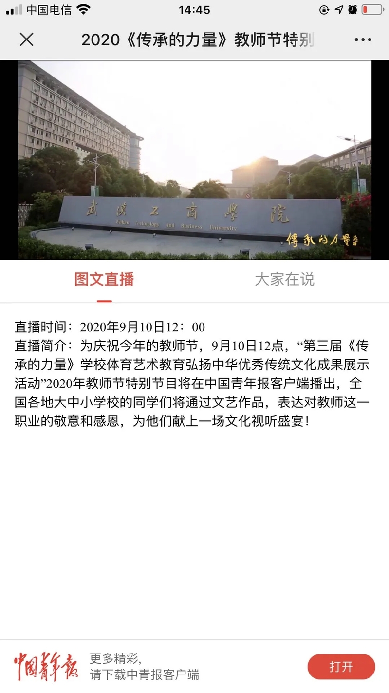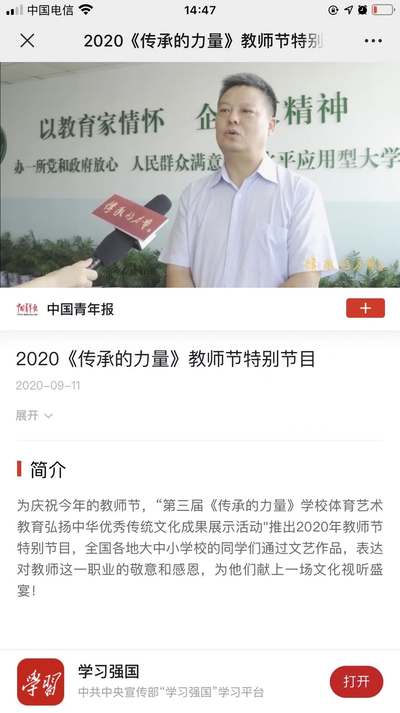中国青年报《传承的力量》教师节特别节目聚焦报道我校传统文化教育成果