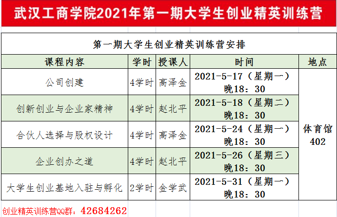 我校第一届大学生创业精英训练营学员培训的时间和地点已确定,如下表所示(学员名单请见附件)。请各学院通知本学院报名学生务必按时参加,并加入训练营QQ群:42684262。