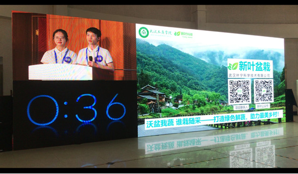 图为“盆栽蔬菜种植订购一体化产业链”项目负责人韦宁宁(右)参加湖北省赛金奖排位赛