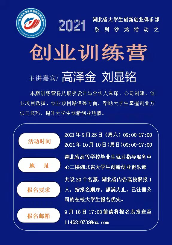 2021年湖北省大学生创新创业俱乐部系列沙龙活动之创业训练营报名啦!