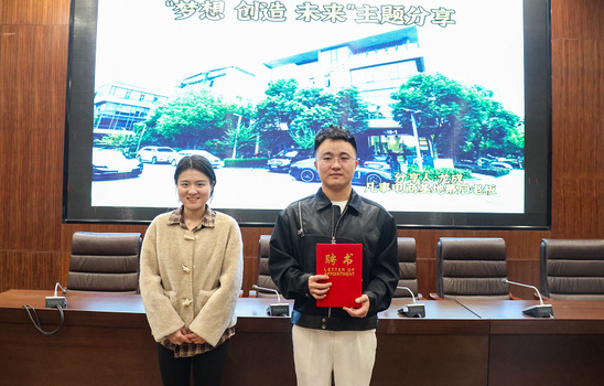 图为学生就业创业指导中心教师吴梦璐为龙成颁发“学生创业指导顾问”聘书