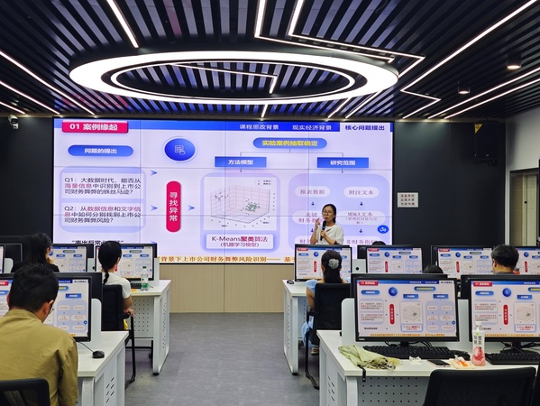 决赛采取“案例展示+现场答辩”的形式展开,评委们根据参赛选手的现场表现及实验教学案例的展示情况进行评分。各参赛选手通过PPT介绍各自实验教学案例的研究与应用,认真回复评委的提问,并和评委们一起就实验教学案例中遇到的问题进行探讨。经过激烈的角逐,大赛最终共评选出一等奖1名、二等奖1名、三等奖1名。其中,管理学院教师周诗雅的案例作品《资本市场高质量发展背景下上市公司财务舞弊风险识别——基于K-Means聚类算法》获得一等奖,该案例基于K-Means聚类算法,建立上市公司财务舞弊风险识别模型,培养资本市场风险防控的管理类人才。