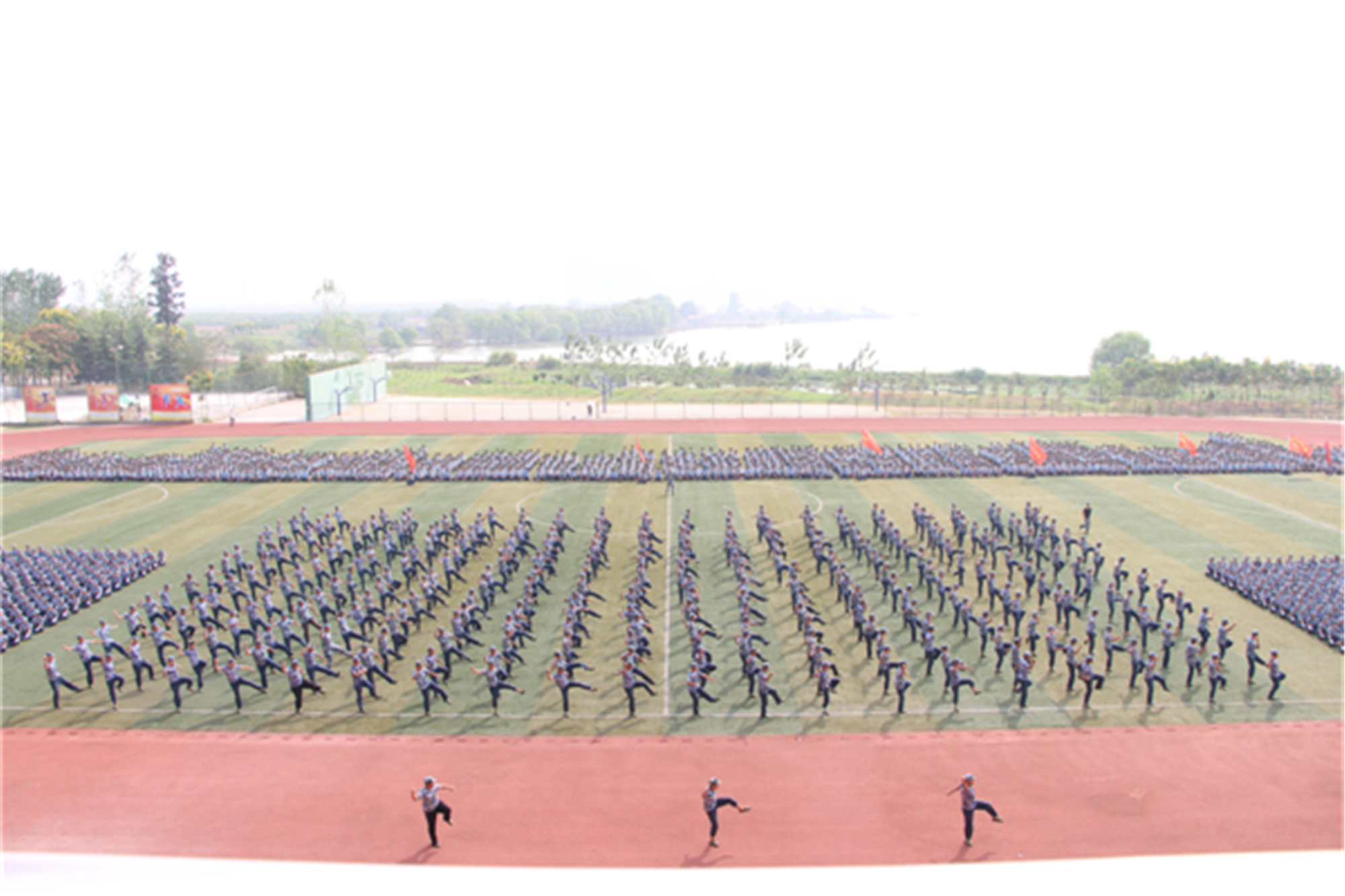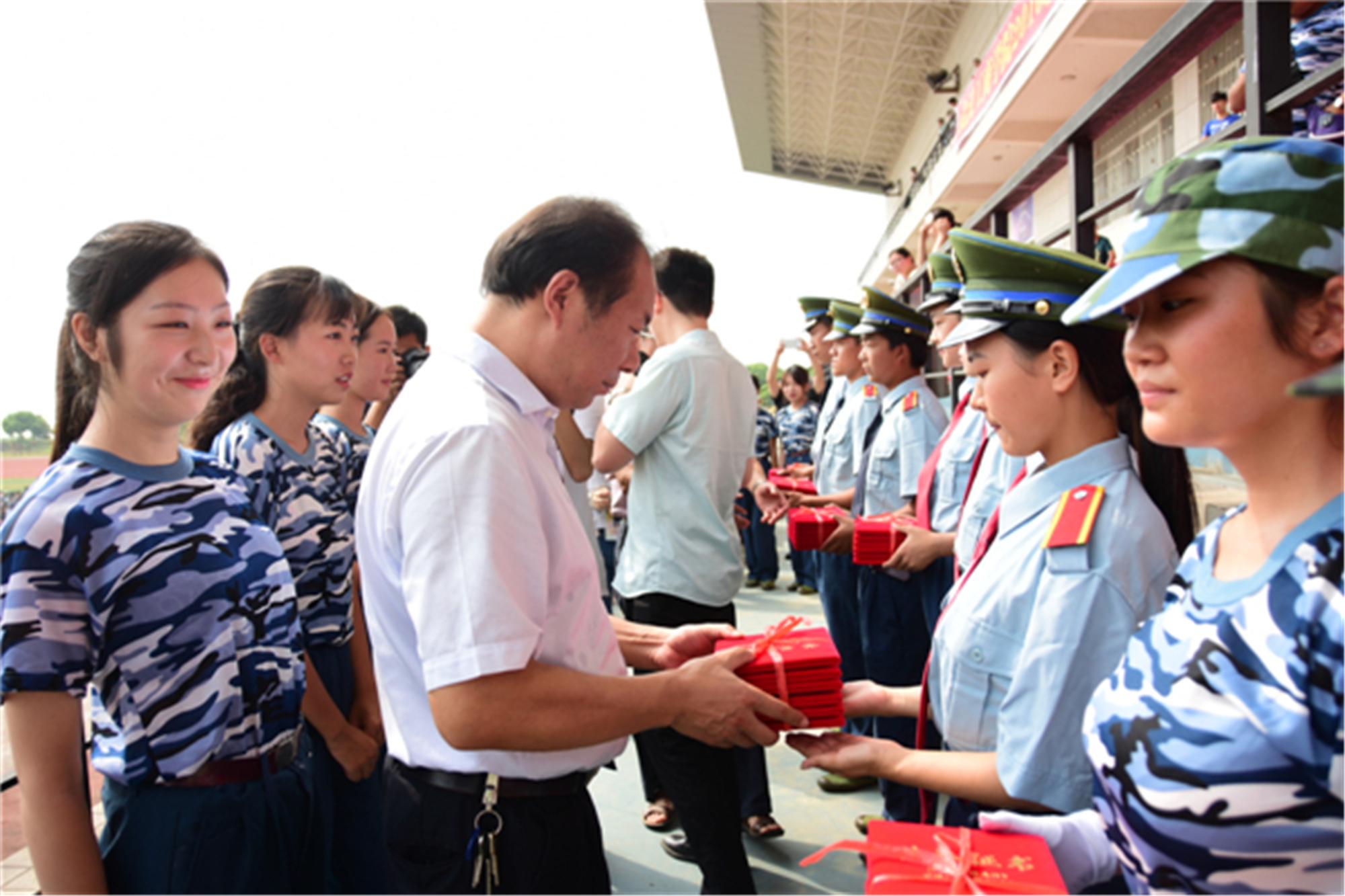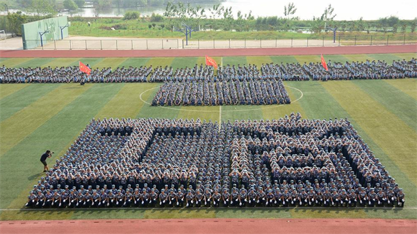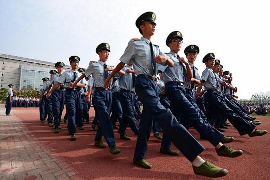 在阅兵式上,来自该校各学院的34支军训方队、1个拳术方阵、2个花样方阵在此接受校党委书记陈伟和军训团团长的检阅。