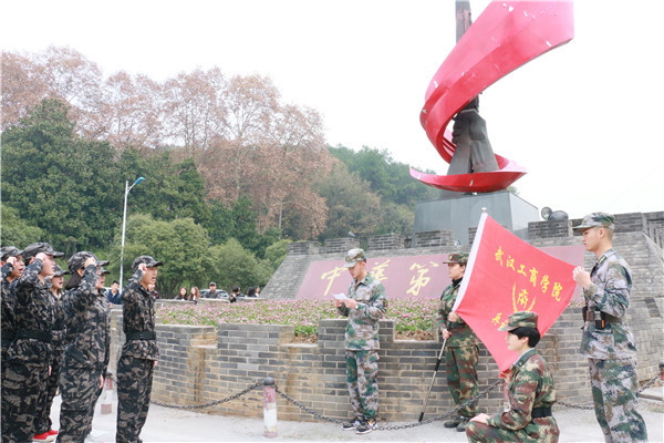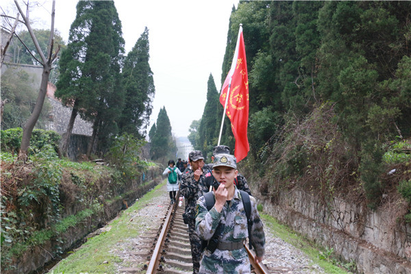 上午8:30,70名学生在该校综合楼广场集合,分成三个小分队,每个分队都由该校退伍大学生担任队长,协调本队的一切工作。三支队伍从综合楼广场出发,沿途经过湖中医、武科大、东澜岸广场、武交职、陈家畈、江夏绿道(西线)等地,最终到达武昌大道二道口公交站。行军速度严格按照部队化要求,快慢结合,同时设定了奔袭路段,让每一名参加模拟长征徒步行的学生都切实体验长征的艰苦。为增加本次活动的特色,行军途中组织各队自由拉歌,同时在休息区域组织了擒敌拳表演和撕名牌活动。