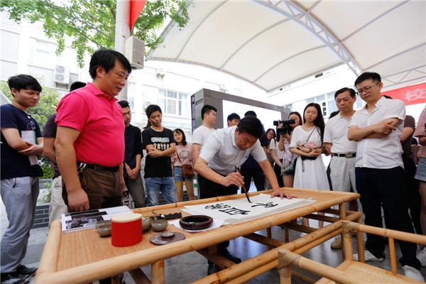 陈伟书记在毕业展上致辞并现场题字。他说,艺术与设计学院每年举办毕业展,毕业生的作品质量不断提高,说明学院的人才培养的质量也越来越高,学院的发展也越来越好,祝愿2017届毕业生们毕业后能够在更广阔的平台上去翱翔,去拼搏,获得更大的成功。