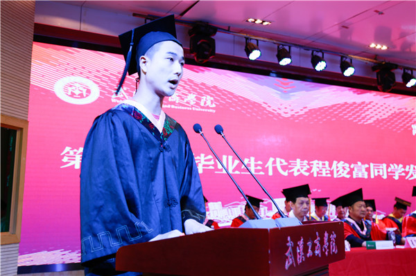经济与商务外语学院应届毕业生程俊富代表毕业生发言。他对转瞬即逝的大学生活表达了留恋与不舍,对四年来各位老师们的谆谆教导和辛劳付出表达了衷心的感谢,并向在座的同学们分享了自己四年来的成长历程。他说:“‘非志无以成学,非学无以广才’,我们要不忘初心,用勤奋和汗水来抒写人生壮丽的篇章,回报母校的辛勤栽培。”