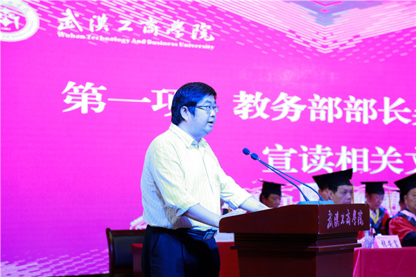 教务部部长吴敏同志宣读《关于同意李卉等2943名毕业生本科毕业的决定》、《关于同意余月等407名毕业生专科毕业的决定》及《必赢国际437官网学士学位评定委员会关于授予李卉等2883名毕业生学士学位的决定》。