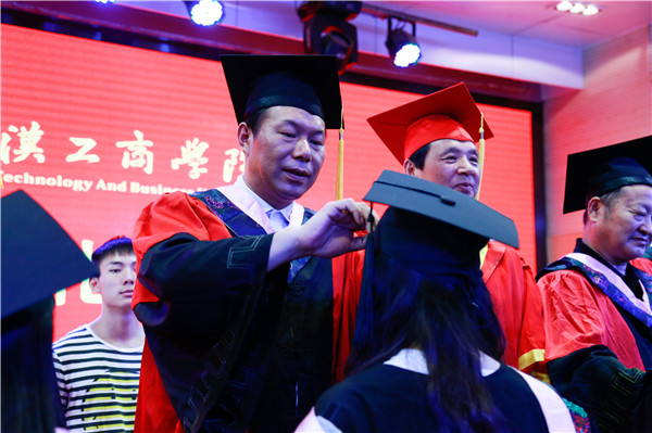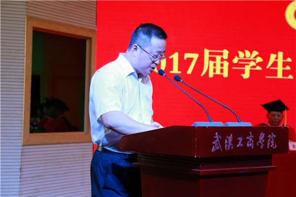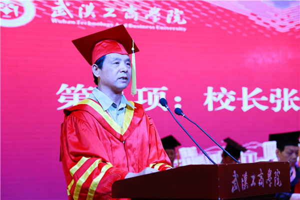 张金隆校长在典礼上发表了意味深长的讲话,他代表学校向全体毕业生表示热烈的祝贺,向辛勤工作、无私奉献的老师和家长们表示衷心的感谢和崇高的敬意。面对广大毕业生,他满怀深情、期待和不舍。“回首大学生活的点点滴滴,都将成为你们珍藏一生的美好回忆。过去四年,学校积极开展内涵建设和应用型人才培养的探索与实践,我们共同经历了学校“更名”、抗洪救灾、本科教学工作合格评估、十五周年校庆等终生难忘的重大事件,见证了学校的蓬勃发展。”谈到同学们在校期间取得的各项成绩,他由衷地感到骄傲和自豪,“在你们身上,传承了一届又一届工商人的精神,学校为你们而骄傲!”