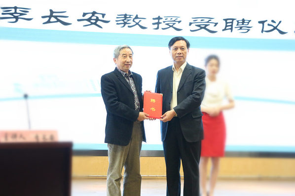 图为张安富校长代表学校向李长安教授颁发聘书 摄影:唐明悦