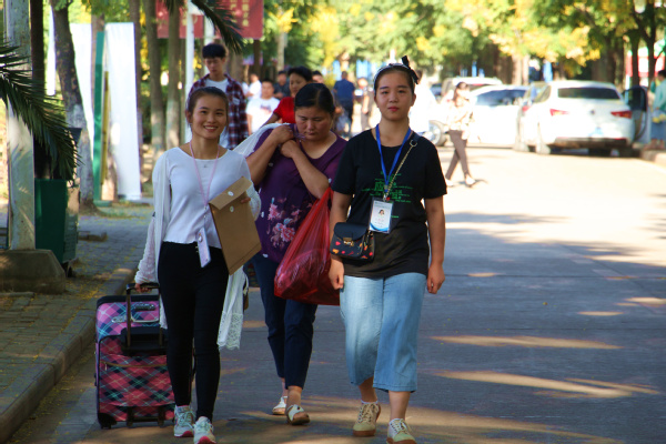 图为志愿者正在带领新生去寝室 摄影:唐明悦