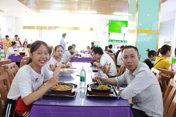 图为大一新生与爸爸正在食堂吃饭 摄影:车瑭甜