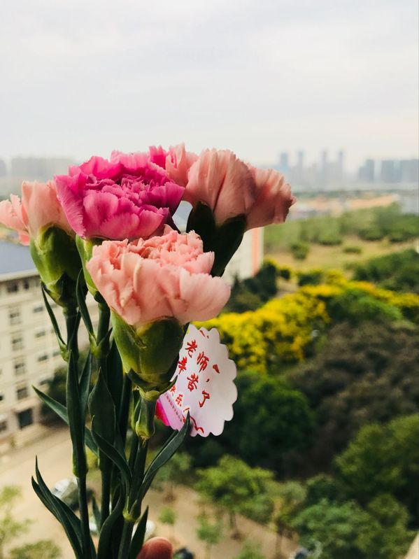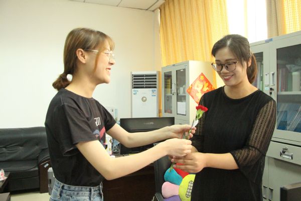 图为校学生会的学生送康乃馨给老师 摄影:孙欢欢