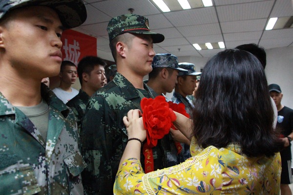 图为张颖老师为新兵佩戴胸花 摄影:韦卓宜