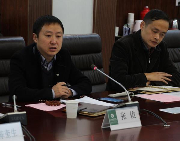图为张俊副校长(左一)说明我校情况 摄影:杜浩辰