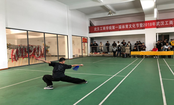 为了激发学生们对武术的兴趣,单项比赛结束后,校武术队队长张砺、队员陈俊杰、大一新生涂李龙还为选手们展示了自选剑、自选刀、自选拳等武术套路,赢得观众们的阵阵掌声。
