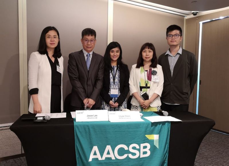 图为必赢国际437官网与会代表与AACSB亚太总部协调员Chee Peng Tan(右一)、认证经理Liyan Chen(中)合影