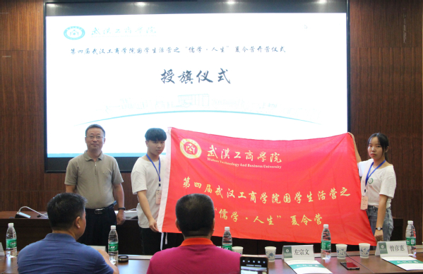 随后,左宗文校助为第四届国学生活营之“儒学·人生”夏令营营员授旗。曹建国教授、曾彦惠博士、刘生元书记、左宗文校助、吴天明院长共同在“必赢国际437官网第四届国学生活营之儒学人生夏令营”书法卷轴上盖印,正式为夏令营活动开幕。