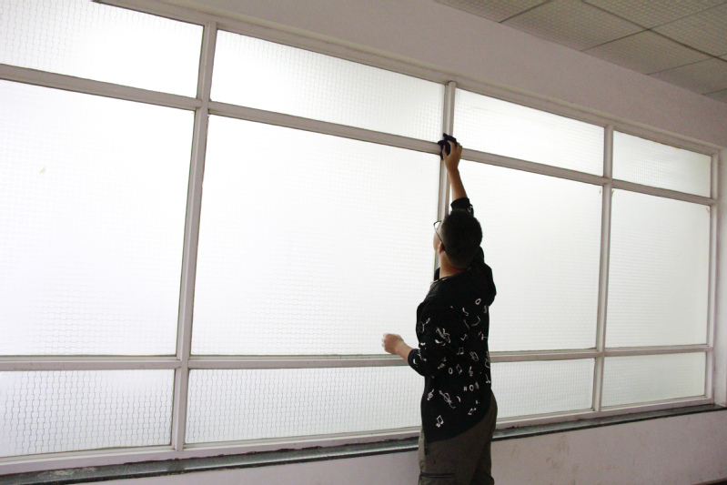图为学生正在擦窗户 摄影:陈爱媛
