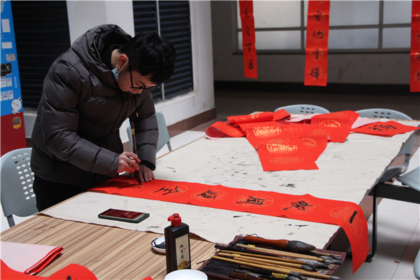 图为逸墨书画协会同学为保卫部送春联祝福 摄影:张焰