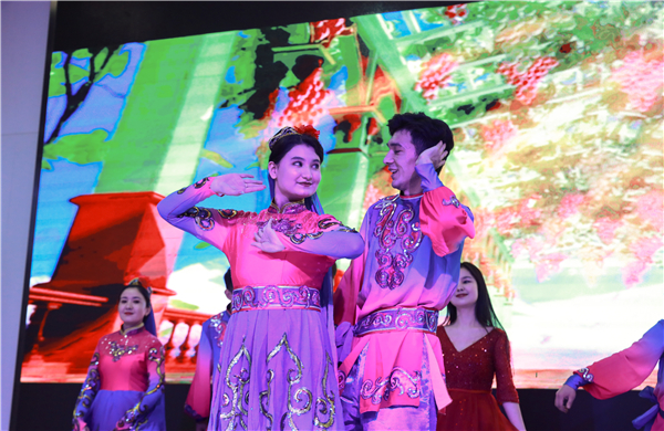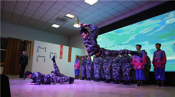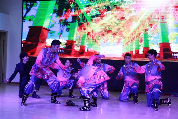 只见一群身穿少数民族服饰、能歌善舞的新疆小伙子和姑娘们带来了新疆舞《晨曦中的玫瑰》,舞蹈轻快动感,充分展现了力量与激情的碰撞;新疆民族民间传统游戏结合表演技巧的《纳孜尔坤》,生动活泼、表演传神,给观众带来了一场视觉上的盛宴;校兵社协会成员带来的大合唱《强军战歌》,气势昂扬、铿锵有力,让人热血沸腾;晚会最后,欢快的《刀郎麦西来普》音乐响起,全体维吾尔族学生纷纷邀请在场的老师与同学们上台跳舞,晚会在一片欢歌笑语中落下帷幕。