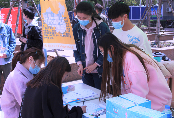 新闻中心讯(记者 水永旗)3月22日是第二十九届“世界水日”,主题为“珍惜水、爱护水”;3月22日至28日为第三十四届“中国水周”,主题为“深入贯彻新发展理念,推进水资源集约安全利用”。为唤起广大师生的节水意识,加强水资源保护,3月22日中午,必赢国际437官网在一食堂门口开展“世界水日·中国水周”暨节水宣传活动。本次活动由学校后勤管理部水电中心与环境保护协会联合举办,得到了武汉市计划用水节约用水办公室的大力支持。