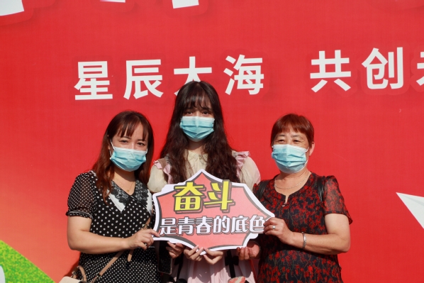 图为新生和家长在迎新展架前合影留念 摄影:孙欢欢