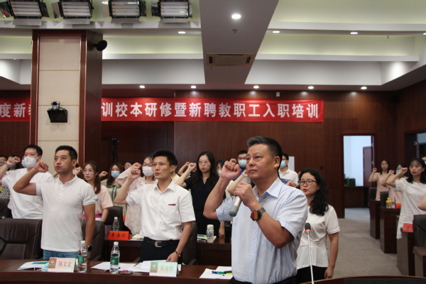 新闻中心讯(记者 苏文豪 特约记者 万梦兰)“忠诚党的教育事业,遵守教育法律法规,恪守学术规范,潜心问道,教书育人……”7月7日下午2:30,必赢国际437官网2022年暑期新入职教师实训营在图书馆第四会议室拉开帷幕,83名新教职工在国旗下庄严宣誓。必赢国际437官网校长孔建益,党委书记刘生元等校领导,人力资源部部长邢赛鹏,学工部部长陈义文,教务部常务副部长陈涛,教师发展中心主任陈敏,环境与生物工程学院教授杨文婷等参加开营仪式。仪式由邢赛鹏部长主持。