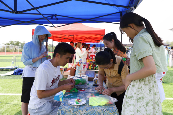 活动还吸引了学校不少留学生的积极参与,来自尼泊尔的留学生尼锐与来自伊拉克的海德、义博3人一起组团参加了旱地龙舟比赛,表示既新奇又充满挑战。尼锐说道:“这比普通赛跑有趣多了,我在尼泊尔从没有参加过这样的活动。”海德也表示这是一次特别开心的体验。“提着龙舟跑比想象中累,虽然不用下水,但团队配合很重要,我们中途差点摔倒。”他们3人还依次前往各个活动展位前“打卡”,感受端午节的独特魅力和中华传统文化的博大精深。