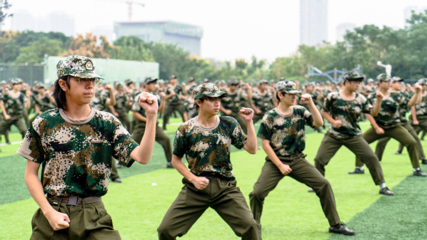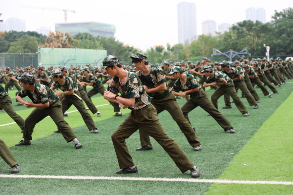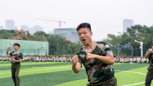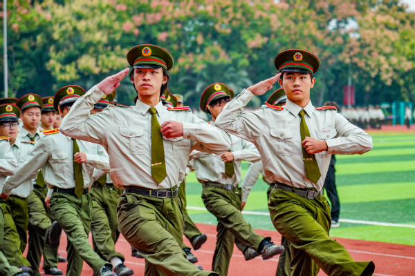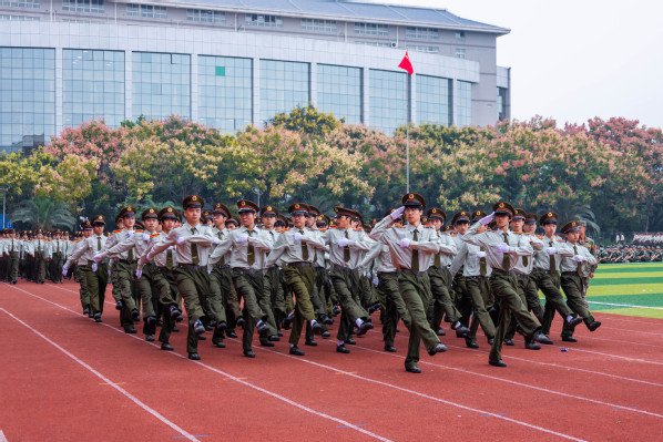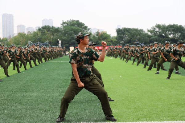 拳术方队的表演点燃全场激情。队员们目光如炬,神采奕奕。冲拳、弹腿、格挡,动作刚劲有力,整齐划一;转身、腾挪、收势,姿态利落干脆,充满力量,充分展现了新生们经过军训锻炼后坚韧不拔的意志和过硬的军事素养。