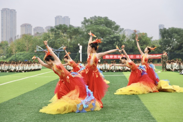 历史画卷缓缓收拢,时代新篇遒劲书写。随后,花样方阵依次变换出校徽、校名、校训以及“五个武工商”等造型,清晰有力地传达了学校的育人理念与办学特色,彰显了学子们的归属感与认同感。