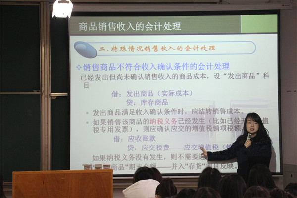 随后,梁老师讲解了确认商品收入的条件,她重点介绍了其中一个条件是企业已将商品所有权上的主要风险和报酬转移给购货方。紧接着,她列举了同学们身边的例子,“淘宝买家给差评的原因之一是刚买的商品降价了,那么,买家这样做有道理吗?”台下的学生互相讨论起来,“没有道理,因为已经交易成功”“有道理,任何卖家都应该有一个售后服务的。”听着同学们讨论的结果,梁老师适时的给出了答案。“这时虽然商品降价了,但是交易已经成功了,也就是说此时商品所有权上的主要风险和报酬转移给了购买方,即使降价了也只能认了,购买方需要承担商品减值的风险,这符合我们的经济原则”。