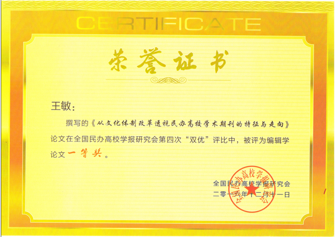 会议期间,开展了全国民办高校学报 “双优”评比活动。评审专家本着公平、公正的原则,从刊物的政治标准、制度规范、学术质量、编辑质量、印刷质量5方面,评审、讨论、打分。我校学报继2013年荣获学报一等奖期刊后,继而获得更高级别的“十佳期刊”称号。全国民办高校学报综合质量评比每三年举行一次,我校学报荣获“十佳期刊”称号,这也是对我校学报办刊水平的充分肯定。与此同时,本次研讨会举行了编辑学论文评优活动,以思想性、创新性和可读性为评判标准,我校王敏老师的撰写的文章《从文化体制改革透视民办高校学术期刊的特征与走向》荣获一等奖。